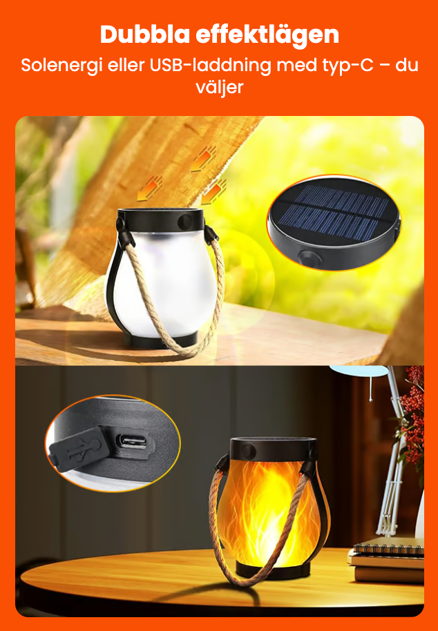 Under dagen laddas den naturligt av solljuset. På kvällen börjar den flamma mjukt och skapar en varm, ombonad atmosfär på altanen, balkongen eller i trädgården.